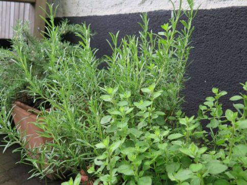 Im April erscheinen seine kleinen hellblauen Lippenblüten. Nach der Blüte im Frühjahr erhält der kleine Busch einen Formschnitt, der ihn kompakt hält. Rosmarin zählt zu den Duftkräutern. Als Heilkraut besitzt er verdauungsfördernde und appetitanregende, sowie entzündungshemmende und antiseptische Eigenschaften. Die verdankt er seiner Mischung aus ätherischen Ölen, Bitterstoffen und Flavonoiden (zu ihnen zählen z.B. die Blütenfarbstoffe). Diese Stoffe sorgen auch für den bitteren und herben Geschmack des Rosmarins, der an Eukalyptus und Kampfer erinnert. Rosmarin verleiht Grillgerichten ein schmackhaftes Aroma und gehört zu den klassischen Gewürzen für Kartoffeln, Kaninchen-, Lamm- und Geflügelgerichte.