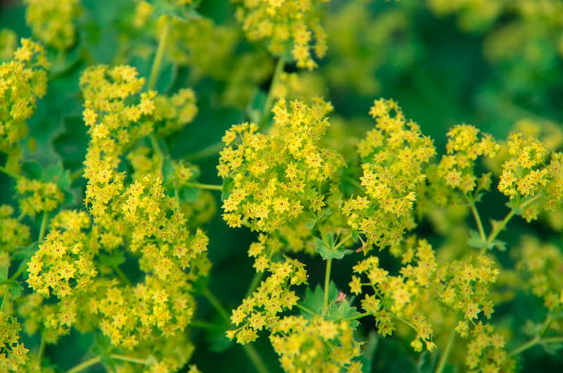 Der Frauenmantel wächst sowohl in der Sonne als auch im Halbschatten. Er kommt mit schweren Böden und anderen schwierigen Bedingungen gut zurecht. Von Juni bis September bilden sich Rispen aus unzähligen gelb-grünen, nektarreichen Blüten an Stängeln mit den kleinen Blättern. Wenn Du die verwelkten Blüten abschneidest und etwas später das alte Laub entfernst, treibt der Frauenmantel erneut aus und blüht meist noch einmal. Die verblühten Rispen lassen sich gut trocknen und für Dekorationen verwenden.
